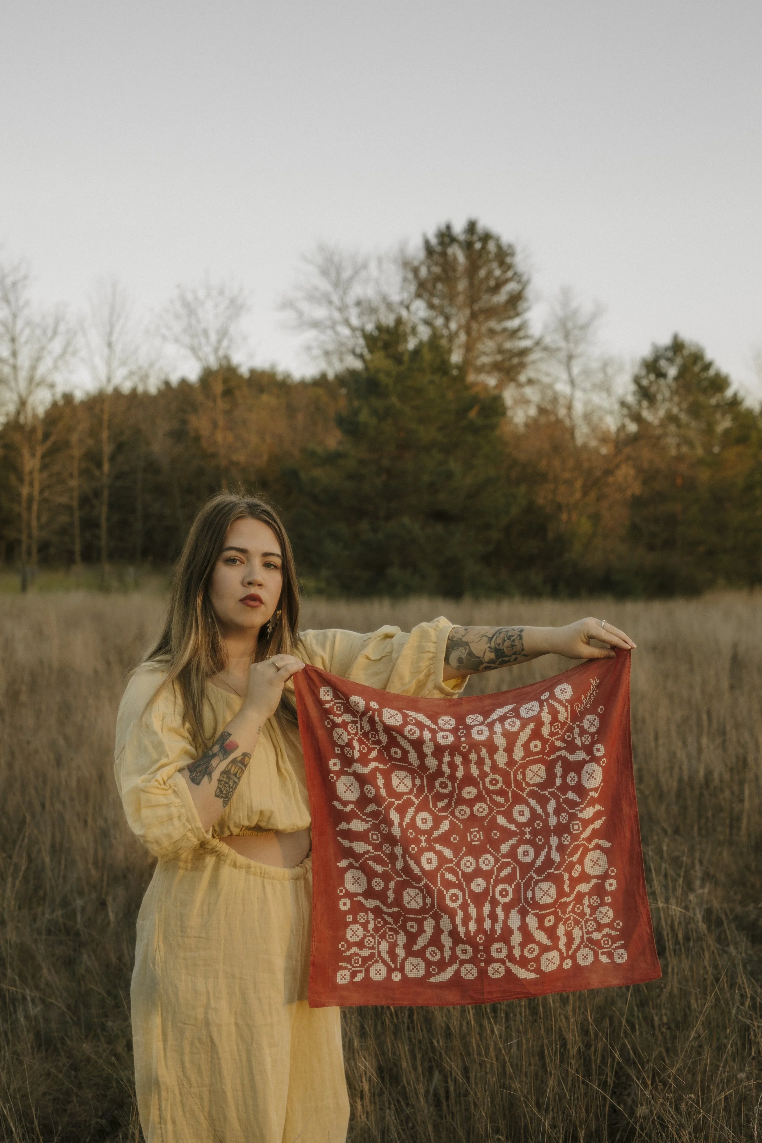 My fatherS staple was a red bandana. He owned an auto-body shop and was never far from a handkerchief. My favorite thing about these work rags was how soft they would get after dozens of washes. In that spirit I have sourced the most incredibly soft and supple organic cotton - and after the many washes during the natural dying process, they have a broken in, well loved feel. The discharge ink used also softens after every wash.